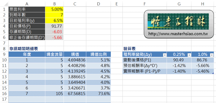 試算表黃色的儲存格是使用者任意輸入的參數,其他儲存格都是計算出來的結果,不可任意變更。只要輸入票面利率及到期年數就可以描述一檔債券的現金流量,所以再輸入想計算存續期間的殖利率,試算表就會計算出存續期間以及修正後存續期間的值。不只如此,存續期間明細表也列出了計算明細。除此之外,右邊的驗算表計算當殖利率變動0.25%及1.0%時,比較修正後存續期間所預估的價格變化率,以及實際的價格變化率之差異。相信透過這個試算表,讀者就更容易了解存續期間的意思了。