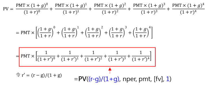 成長型PMT(type=0)使用PV函數公式推導: