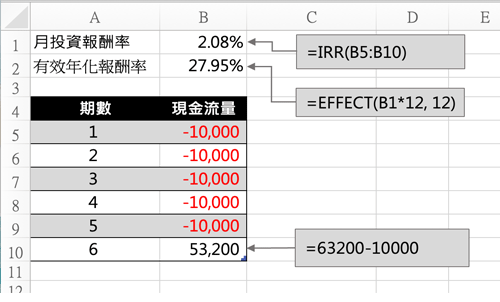 圖二就是用IRR計算的公式, B5~B10這6個儲存格描述6期的淨現金流量,只要將儲存格範圍當作IRR的參數輸入即可,所以B1的公式為【=IRR(B5:B10)】,就得到投資報酬率每月2.08%,若要換算成年化報酬率可以用EFFECT函數,B1乘上12是名目報酬率,第2個參數是複利次數。B2年化報酬率【=EFFECT(B1*12, 12)】,結果等於27.95%。