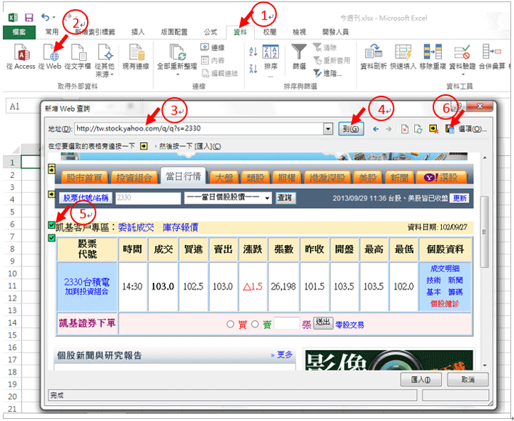 這網頁的網址就顯示於上方:http://tw.stock.yahoo.com/q/q?s=2330。只要用這網址就可以做成一個Excel連線,Excel的工作表可以根據這連線,就可以直接擷取到這網頁所顯示的資料。