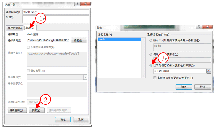 就成為一個含有參數的網址,參數名稱為code。這code參數可以置於任何儲存格內,例如將code參數定義為B1儲存格,那麼當B1儲存格的值為2412時,那麼Excel會將網址解釋為:http://tw.stock.yahoo.com/q/q?s=2412,也就是中華電的股價網址。這就非常方便了,只要更改儲存格上的股票代號,Excel就會自動抓取到該代號的股價了。