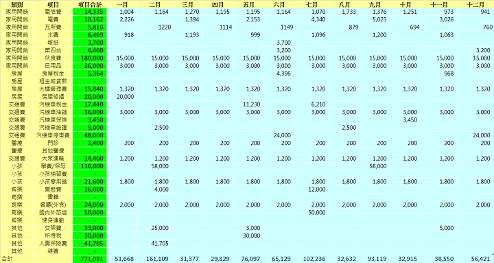 檔案有預算表、日記帳及分類帳共三張的工作表。點選“預算表”, 按照費用的類別,一項一項按月填入自己的支出預算,試算表會自動加總年度的總費用,以及每個月的現金流量。經常性的支出如電費、電信費、瓦斯、第四台等,可以依照去年的收據的數字調整就好。
