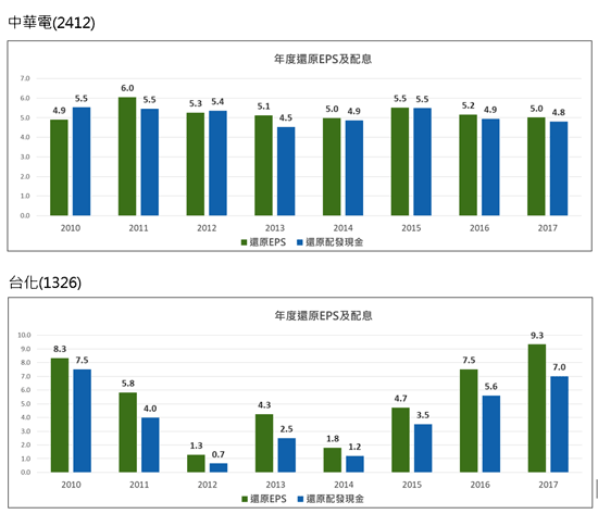 同樣每年200萬元的配息,中華電要投入4,167萬元,而台化只要3,374萬元,看起來似乎台化比較有利。但是從歷年的台化配息拿出來看,發現每年的配息高高低低,去年的配息是近7年來最高的一次,其中2012年還低到每股只發0.7元現金,也就是說每股配7元並非常態。反觀中華電的配息年年非常穩定,平均落在每股5元。因為中華電配息較穩定,所以投資者願意要求較低的報酬,所以股價就會較高,反映出來的就是殖利率較低。