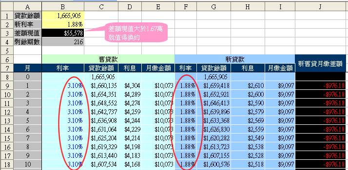 如何決定是否該換約呢?新約顯然利率較低,但是換約得付費用貸款餘額的1%。因為目前都還是在3.1%固定利率期間,目前的貸款餘額為1,665,905,1%費用就是1.67萬。其實最容易算的是將舊約及新約每月的繳款金額算出來,然後求其差額,再將這每月差額之現金流量換算成現值來比較。