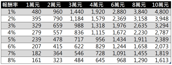 表一是上述公式計算出的結果,條件是60歲退休,通貨膨脹率每年1.0%,每一欄位是退休後每月需求金額,每一列則對應至不同報酬率所需的退休金。例如退休後每月需求4萬元,若投資報酬率為4.0%,那麼60歲退休時就得準備1,115萬元,才足夠提領至100歲為止。若是投資報酬率設定8.0%,同樣每月4萬元卻只要準備645萬元就可以了。