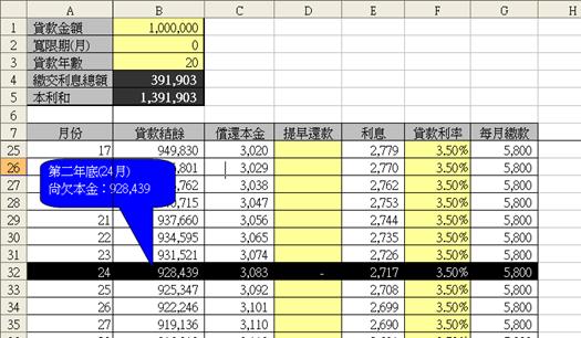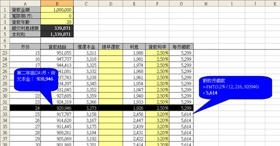 以同例子來說,前一段的優惠利率2.5%雖然只適用兩年,但是在計算2.5%的月繳款時,是假設貸款金額是100萬元,直到期滿20年都適用2.5%,然後以這條件所計算出來的本息平均攤還金額。計算第二段利率3.2%的月繳款時,亦假設第三年到期滿總共18年都適用3.2%的利率,但是貸款金額必需使用上一段利率結束的貸款本金餘額,亦就是繳完第二年後,還欠銀行多少本金。這金額可以由前一段利率的攤還表得知為920,946。