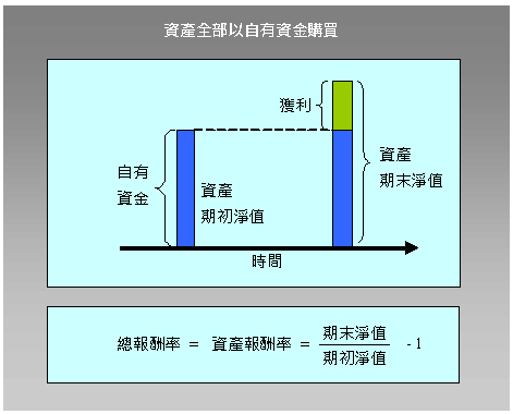 資產報酬率和資金的取得方式是無關的,但是投資者的報酬率卻和如何取得該資產的資金方式息息相關。投資者可以用全額自有資金,或者是部分自有資金、另一部份以貸款來取得該項資產。依據貸款金額與自有資金比例之不同,所得到的投資報酬率(總報酬率)是不一樣的。
