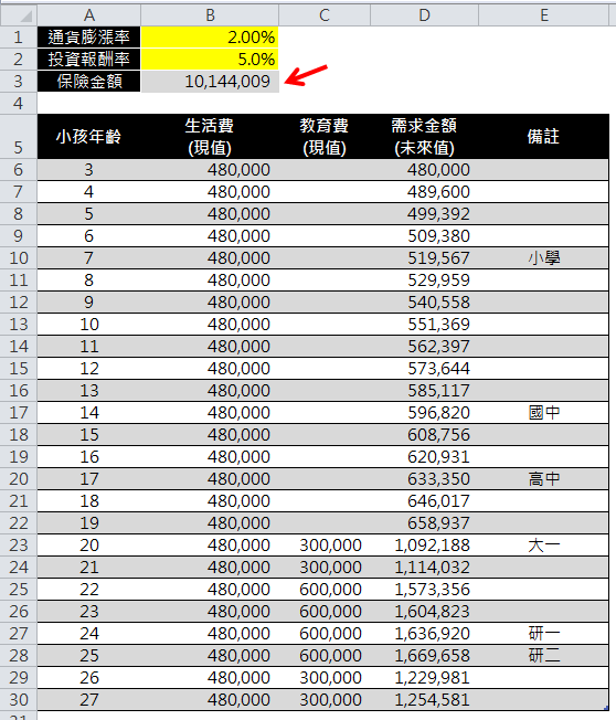 依此類推,將每一年的生活費及教育費加總,再列出經過物價調整後的金額,所以D欄列出了每一年物價調整後的實際需求。