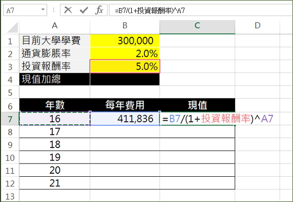 上述公式只有上大學一年級的學費,如果大學加上研究所一共需要6年,每年的費用經過通膨調整後都不一樣,且現值也會不一樣。如果要一個個公式分別輸入也未嘗不可,但是每當條件改變時,公式就得一一跟著調整才行,麻煩又容易出錯。一個好用的試算表,必須滿足使用者可以任意更換試算條件。例如當通貨膨脹率、或者投資報酬率改變時,需要總現值是多少。本篇教導讀者如何製作一個好用的試算表。