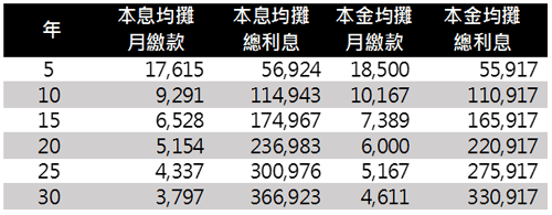 例如圖一的本息平均攤還,貸款年數從5年增加到10年,只不過多了5年期間,月繳款可以從1萬7,615元,快速降到9,291元,總繳利息增加了5萬8,019元,雖然多了利息但是每月繳款金額卻少很多。可是當貸款年數從15年增加到20年,同樣5年期間月繳款卻只降一點點,從6,528元降到5,154元,總利息卻增加了6萬2,017元。若選擇15年而不是20年,每期只要多繳一點,卻可以省下大幅的利息。