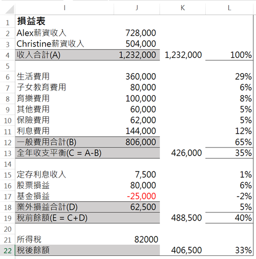 Alex的年收入共72萬8,000元,Christine的年收入為50萬4,000元,收入是薪資單上的扣除勞保、健保的實領薪資、加班費及獎金。嚴格說來,薪資收入必須跟健保及勞保分開列才正確,薪資是收入,勞保及健保是費用。但是家庭財報並不用那麼精細,混在一起及分開列只會影響毛利率,可是毛利率在家庭財報中一點意義都沒有,所以直接將薪資單上的實領金額,再把「預扣所得稅」的金額加回去即可。