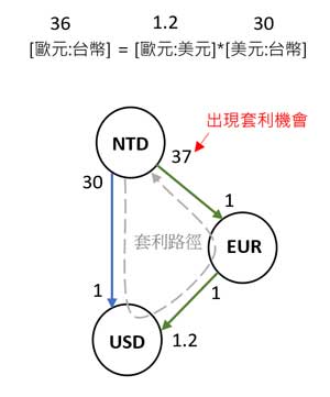 假設某一時間點,美元跟台幣的匯率是1:30,歐元對美元為1:1.2,那麼歐元對台幣的匯率一定得是1:36 (30x1.2)。如果歐元對台幣匯率發現是1:37元,套利機會就出現了。套利者使用圖一的套利路徑,跟銀行借出30萬台幣,直接以1:30匯率換到1萬美元,然後用歐元對美元匯率1:1.2,換成8,333.33歐元,再用1:37歐元對台幣匯率換回30萬8,333元台幣,30萬元台幣還給銀行,剩下的8,333元台幣直接落袋,沒有任何風險,交易是立即的利息可以忽略不計。這樣的交易是賣台幣買美元、賣美元買歐元、以及賣歐元買台幣,每一次套利交易都使得台幣對美元貶值以及台幣對歐元升值,迫使匯率符合上述等式。