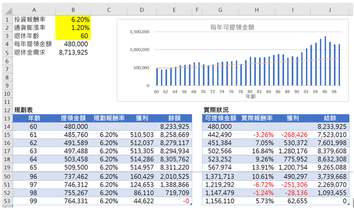 假設退休後實際投資的報酬率如表二實際狀況表所描述,第1年-3.26%、第2年7.05%、第3年16.84%..。第1年提領金額48萬元,第2年可提領金額44萬2,490元【=480000*(1+1.2%)*(1-3.26%)/(1+6.2%)】,因為前一年報酬率虧損3.26%,第3年可提領金額為45萬1,384元【=442490*(1+1.2%)*(1+7.05%)/(1+6.2%)】,因為報酬率為7.05%,第4年可提領金額為50萬2,566元【=451384*(1+1.2%)*(1+16.84%)/(1+6.2%)】,其他年度依此類推。表二的柱狀圖就是各年度可提領金額,而橘色直線代表規畫年金,就是報酬率都不變(6.2%)的可提領金額。